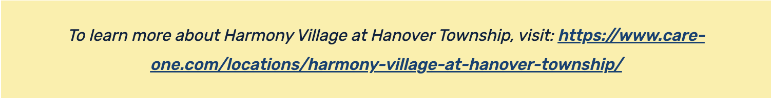 Harmony Village at Hanover Township is a vibrant CareOne community dedicated to creating a comfortable and stimulating environment for their residents living with memory impairments.